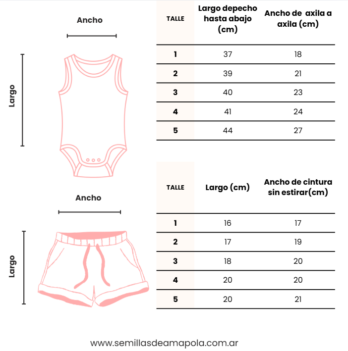 Guía de talles: Utilizala para comparar con las medidas de alguna prenda de tu bebé. Tené en cuenta que, debido a diferentes procesos de confección, las medidas son aproximadas.